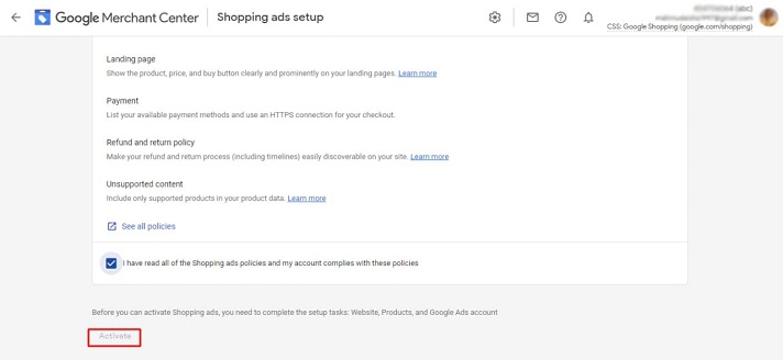 After that, you have to provide some required information according to your business such as Tax, Shipping, Website, Products, Google Ads Account. Also, you can specify the viewers of your content. Moreover, you can check some review policies, if you agree with these, then you can mark on the checkbox and click on the Activate button.